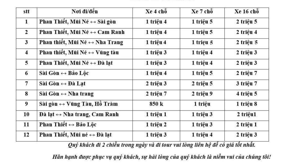 các tuyến xe phổ biến